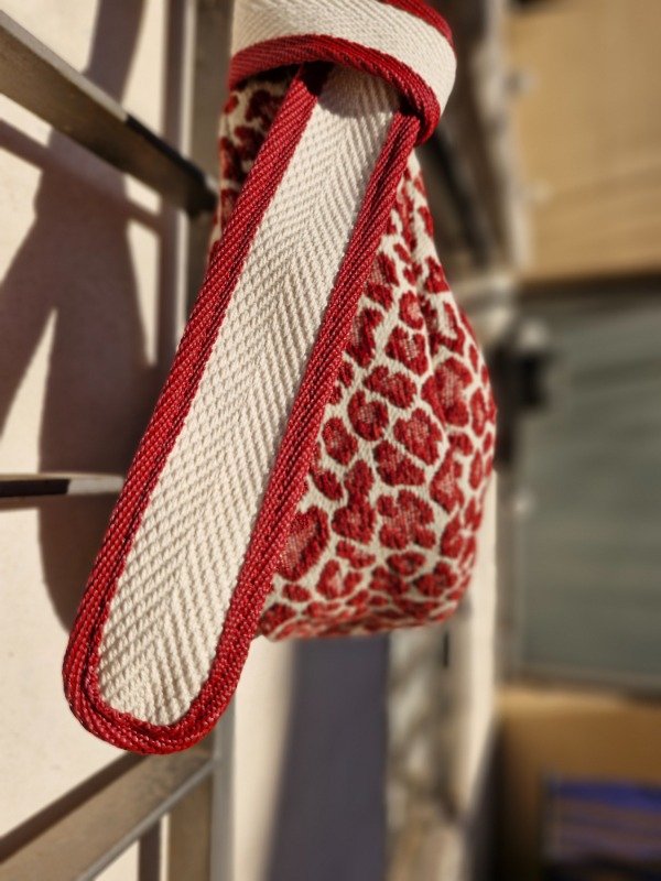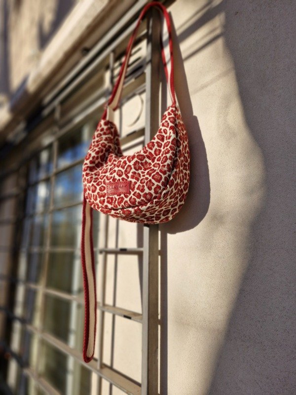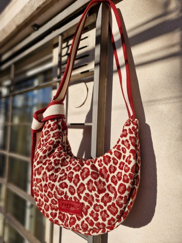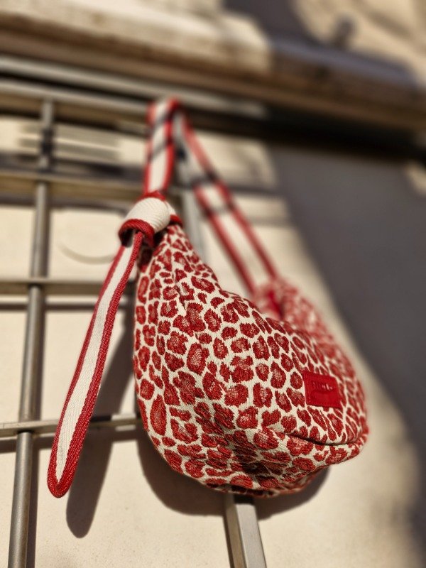 Cartera confeccionada en tela de tapiceria animal print premium, con correa reforzada de algodón y decorada con cinta en laterales a tono. Correa regulable.