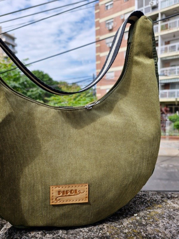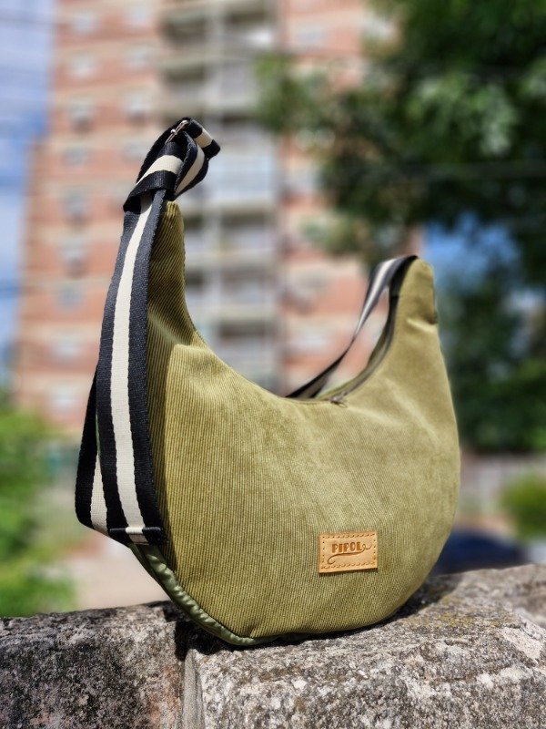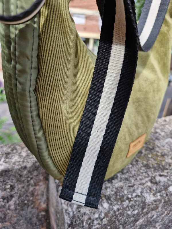 Cartera confeccionada en tela satinada y corderoy, con base acolchonada con costuras decorativas. Regulable hasta 120 cm.