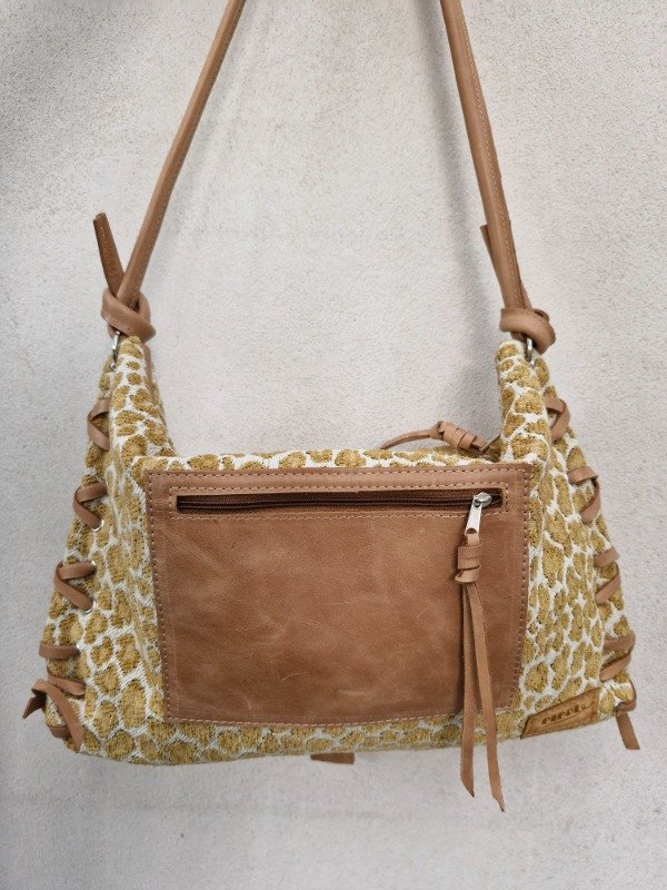 Confeccionada en tela de tapicería animal print, en tonos hueso y amarillo. Medidas: 42cm ancho x 30 cm de alto, y 4cm de fuelle. Apertura mediante cierre ykk metálico, interior forrado en silver del mismo tono, ojales en laterales con lazo en cuero y correa al hombro.