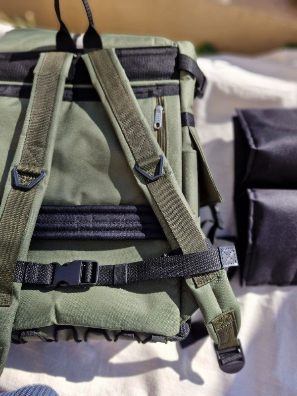 Material externo e interno: cordura y silver. Cuerpo reforzado, asas regulables acolchonadas con goma espuma y dados cuelga elementos, sujetador pectoral.